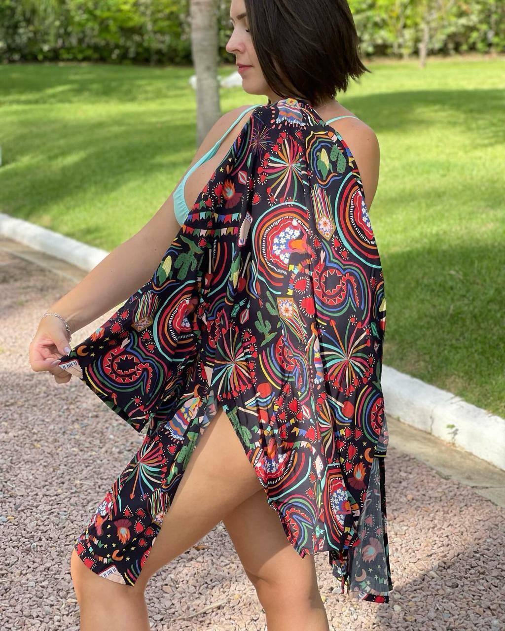 Kimono comprimento médio em viscose, com abertura lateral para amarração.
